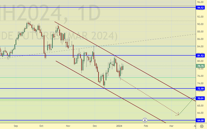 Сценарий роста: рассматриваем февральский фьючерс, дата экспирации 22 января. Если будет рост выше 76.30 можно будет подумать о покупках.