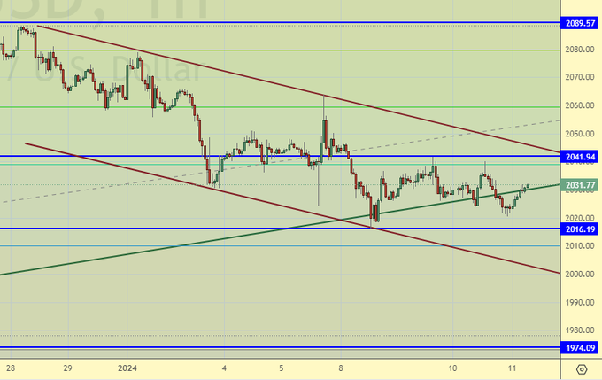Ждем сегодня выход данных по инфляции в США. Золото в целом заряжено на продолжение падения. Странно будет видеть его рост, но если придется, то думать о покупках лучше после подъема над 2050. Доллар пока сохраняет свою привлекательность для расчетов, тем более что в мире спокойней не становится. Сам ли Вашингтон провоцирует напряженность или это происходит на местах само по себе в данном случае не важно.