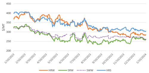 Внутренний рынок: Котировки в США снизились после декабрьского отчета WASDE, что отражает адекватные мировые поставки, усиление конкуренции по мере поступления на рынок сельскохозяйственных культур из Южного полушария и сильный доллар США. Цена Soft Red Winter (SRW) упала на 14 долларов до 259 долларов за тонну из-за замедления спроса со стороны Китая. Цены на Hard Red Spring (HRS) снизились на 14 долларов до 304 долларов за тонну, отражая усиление конкуренции со стороны канадской яровой пшеницы. Цена Soft White Winter (SWW) также упала на 14 долларов до 259 долларов за тонну. Цена Hard Red Winter (HRW) упала на 9 долларов до 285 долларов за тонну, что отражает недавние осадки в поясе HRW и благоприятные условия выращивания по сравнению с прошлым годом.
