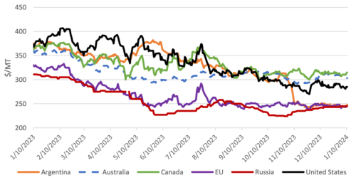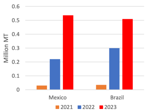 Мексика является еще одним рынком Западного полушария, где Россия увеличила долю рынка. В отличие от Бразилии, Россия ранее экспортировала большие объемы пшеницы в Мексику, но экспорт сократился с 2019/20 по 2021/22 год. Россия вернулась на мексиканский рынок в 2022/23 году, экспортировав 600 000 тонн, и готовится установить новый рекорд торгового года в 2023/24 году с более чем 400 000 тонн за первые 5 месяцев. Соединенные Штаты неизменно являются крупнейшим источником импорта пшеницы в Мексику, и, хотя в 2023/24 году это останется так, импорт из России подорвет некоторую долю рынка США.