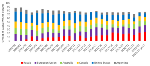 За последние 20 лет Россия заняла видное место в мировой торговле пшеницей. Будучи нетто-импортером в 1999/00 маркетинговом году (МГ), Россия, по прогнозам, станет крупнейшим в мире экспортером четвертый год подряд. Россия все больше становится ориентированной на экспорт, поскольку рост производства опережает рост внутреннего спроса. Кроме того, расширение мирового импорта пшеницы позволило России стать ведущим мировым экспортером, завоевав долю рынка за счет большинства других крупных экспортеров, включая Европейский Союз, Канаду, США, Австралию и Аргентину. В 2023/24 году Россия намерена установить новый мировой рекорд экспорта — 51,0 млн тонн, что на 3,5 млн тонн больше, чем в предыдущем году. Одним из способов достижения такого роста является расширение экспорта на рынки Западного полушария. Несмотря на большее расстояние от российских портов до рынков Западного полушария по сравнению с другими конкурентами, более низкие экспортные цены из России перечеркнули преимущество этих экспортеров в сфере грузоперевозок.