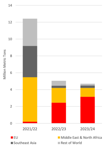 Учитывая высокие темпы импорта из Украины, прогнозируется, что импорт пшеницы в ЕС вырастет на 2,5 миллиона тонн в этом месяце до 11,0 миллионов, что все еще немного ниже, чем в предыдущем году. Спрос ЕС на импорт пшеницы резко возрос в 2022/23 году из-за сильной засухи в Испании и снижения урожайности в Германии. Учитывая меньший урожай пшеницы и продолжающийся спрос на кормовые ингредиенты, Испания стала основным направлением для украинской пшеницы в этом году, за ней следует Румыния.