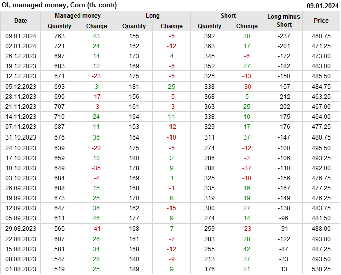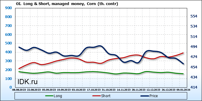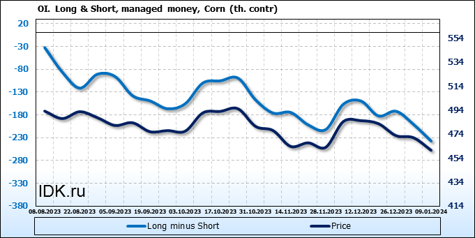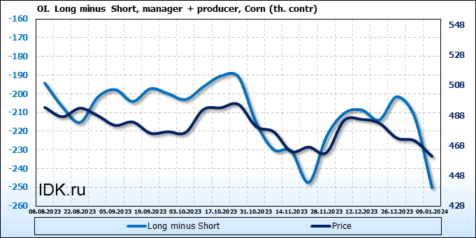 За прошлую неделю, 03.01.24 — 09.01.24, разница между длинными и короткими позициями управляющих увеличилась на 36.3 тыс. контрактов. В тоже время, цена упала на 10.5 цента.