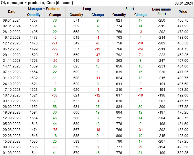 За прошлую неделю, 03.01.24 — 09.01.24, открытый интерес вырос на 80 тыс. контрактов. Объем вовлеченных в торговлю контрактов составляет 1 410 115 штук. Текущее положение дел на рынке таково, что деньги в течение прошлой недели приходили на рынок поддерживая тенденцию.