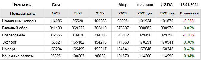За прошедший месяц министерство сельского хозяйства США (USDA) на 12.01.2024 пересмотрело Баланс сои для Мира в сезоне 23/24 следующим образом: