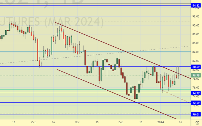 Сценарий роста: рассматриваем январский фьючерс, дата экспирации 31 января. Будем покупать в случае роста выше 81.60. Пока есть сомнения в способности быков развернуть тренд вверх.