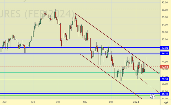 Сценарий роста: рассматриваем февральский фьючерс, дата экспирации 22 января. Если будет рост выше 76.30 можно будет подумать о покупках.