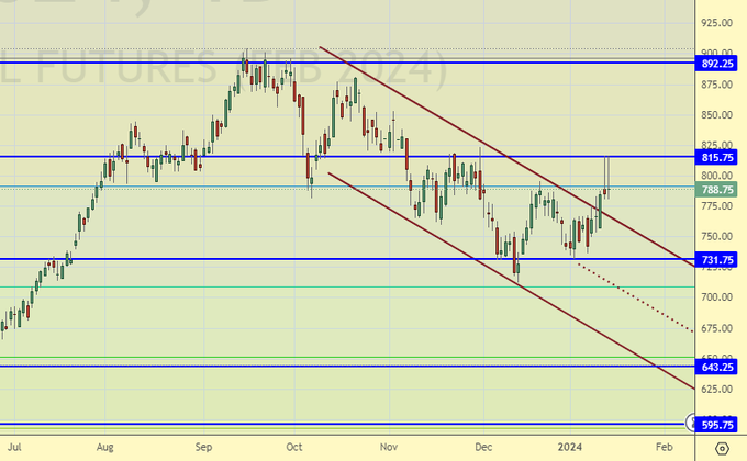 Покупка: думать при подходе к 600.00. После роста выше 830.00. Стоп: 770.00. Цель: 1200.00.