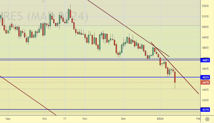 Продажа: нет. Кто в позиции от 470.0, перенесите стоп на 467.0. Цель: 422.0 (пересмотрена).