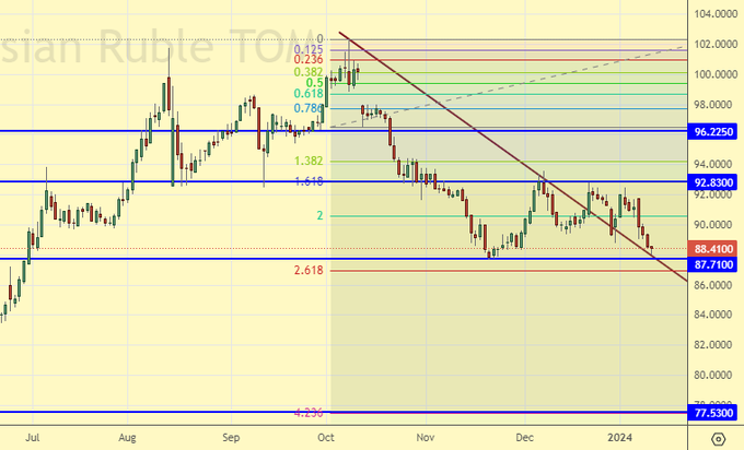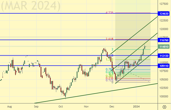 Сценарий с падением на 65.00 по Brent, о котором можно было рассуждать в конце декабря, стал маловероятным. Если понедельник у нас закрывается длинной зеленой свечой, то стоит посмотреть по нефти на 120.00.