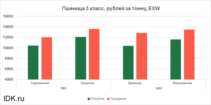 За прошедшую неделю с 18.12.2023 по 22.12.2023 средняя цена на пшеницу 3-го класса, согласно выставленным заявкам трейдеров, выросла по всем округам на 520 рублей. Средняя цена составляет 12334 рубля за тонну.