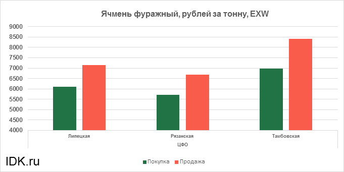 За прошедшую неделю с 18.12.2023 по 22.12.2023 средняя цена на фуражный ячмень, согласно выставленным заявкам трейдеров, упала по всем округам на 150 рублей. Средняя цена составляет 6754 рубля за тонну.