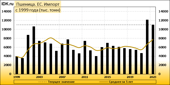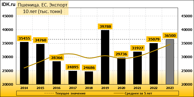 Экспорт мягкой пшеницы из Европейского Союза снизился на 11% до 15,84 млн тонн с начала сезона 2023/24 в июле по сравнению с годом ранее. Экспорт пшеницы из ЕС в этом сезоне сдерживается сильной конкуренцией со стороны России, в том числе в Алжире, хотя разрыв по сравнению с прошлым сезоном за последние недели сократился, отчасти благодаря поставкам из Франции в Китай. В пятерку крупнейших направлений экспорта мягкой пшеницы из ЕС в 2023-2024 годах входили Марокко (2,24 миллиона тонн), Нигерия (1,54 миллиона), Алжир (1,37 миллиона), Египет (1,28 миллиона) и Южная Африка (796282).