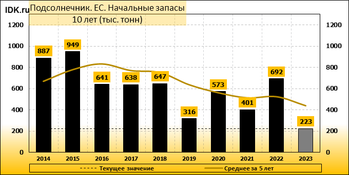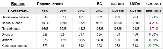 За прошедший месяц министерство сельского хозяйства США (USDA) на 12.01.2024 пересмотрело Баланс подсолнечника для ЕС в сезоне 23/24 следующим образом: