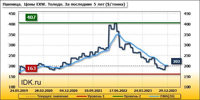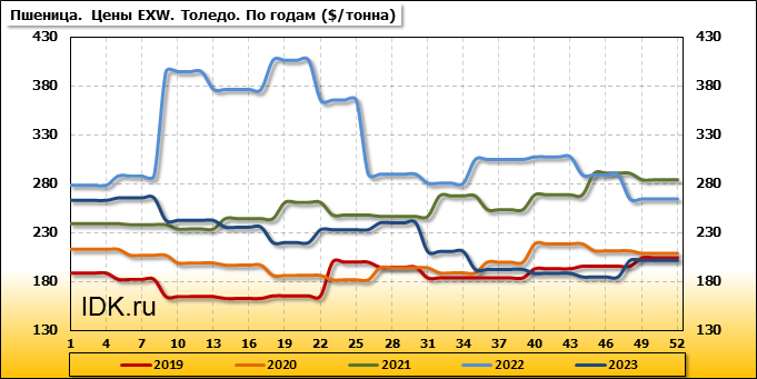 Внутренние цены на пшеницу SRW в городе Толедо (США) выросли на 16.9 $/т. и на отчетный месяц составляют 201.66 доллара за тонну.