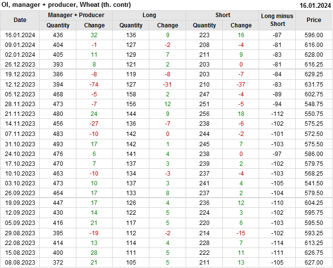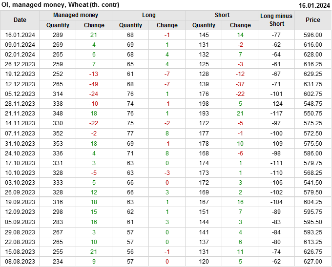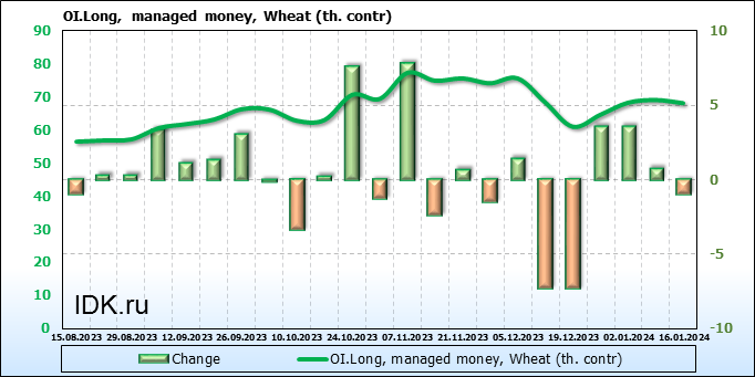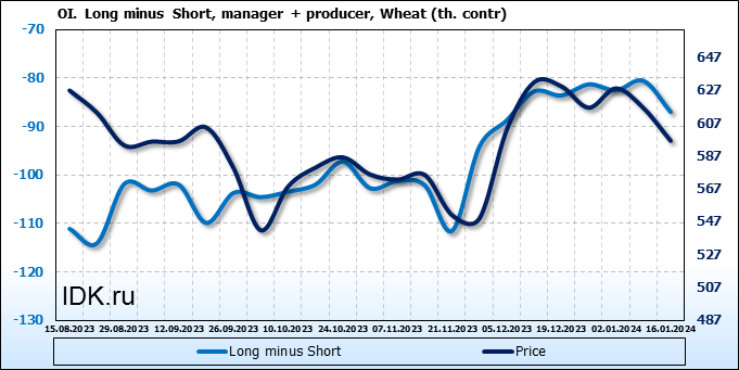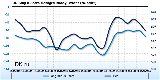 За прошедшую неделю, 10.01.24 — 16.01.24, разница между длинными и короткими позициями управляющих увеличилась на 15.1 тыс. контрактов. В тоже время, цена упала на 20 центов.