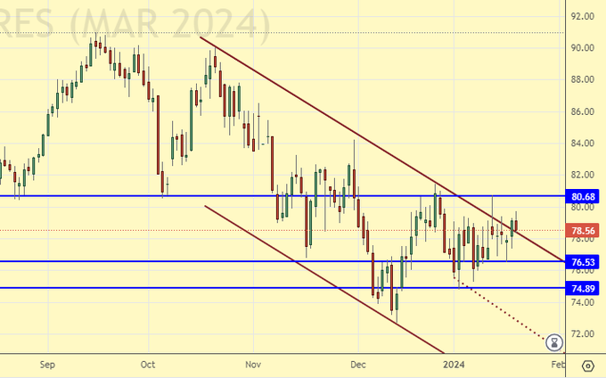 Сценарий роста: рассматриваем январский фьючерс, дата экспирации 31 января. Для покупок без перемен: будем покупать в случае роста выше 81.60. Пока есть сомнения в способности быков развернуть тренд вверх.