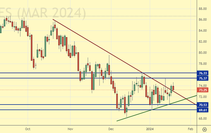 Сценарий роста: рассматриваем мартовский фьючерс, дата экспирации 28 февраля. Ничего нового для покупателей. Если будет рост выше 76.30 можно будет подумать о покупках.