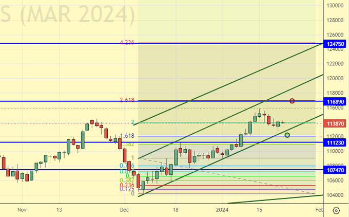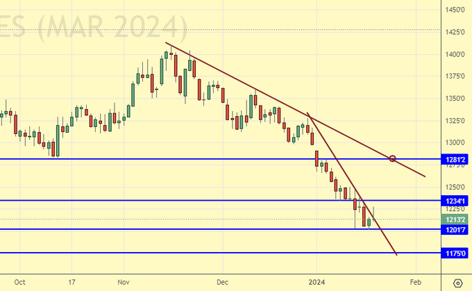 Сценарий роста: рассматриваем мартовский фьючерс, дата экспирации 21 марта. Рост приостановился, но мы продолжаем оставаться в растущем канале. Рост к 125000 возможен. Здесь надо искать возможности для покупок. Хорошие дивиденды российских компаний поддерживают рынок.