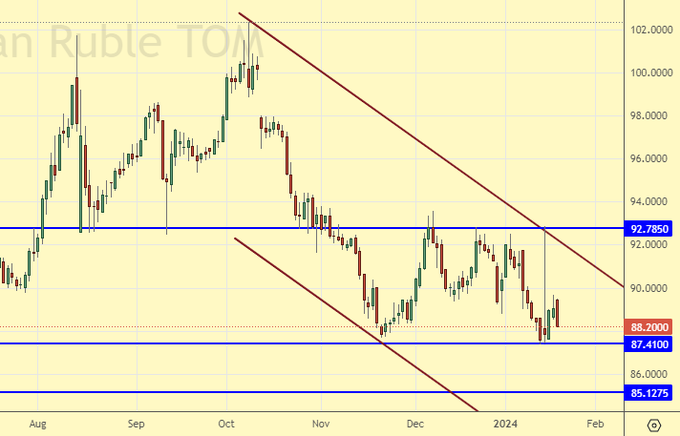 По итогам 23-го года сальдо торгового баланса России оказалось на уровне плюс 118 млрд. долларов, что ниже великолепного 22-го года (197 млрд. долларов), но вполне достаточно для покрытия всех расходов. Подобные показатели вместе со ставкой в 16% помогут сохранить стабильность рубля. Да, мы можем предполагать некоторое ослабление или укрепление национальной валюты, но оно не будет носить кратный характер, а скорее ограничится диапазоном плюс минус 10 – 15% от текущих уровней в 24-м году.