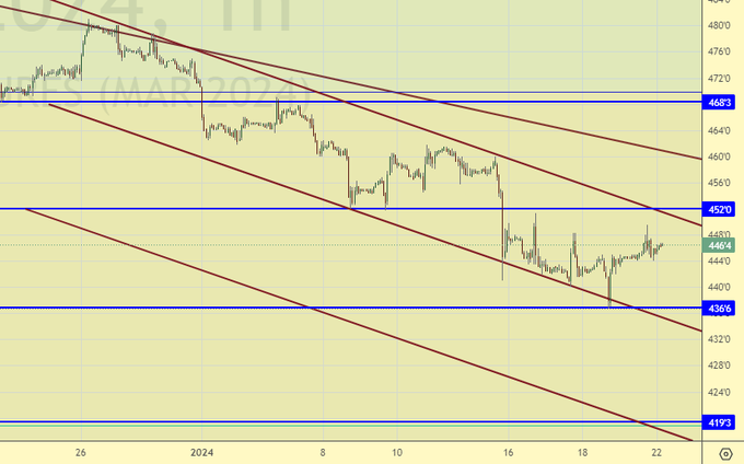 Кукуруза пытается расти, но не может, так как предложение велико. Продолжаем ждать падения цен к 420.0.