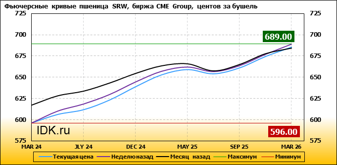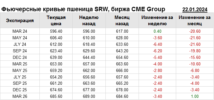 На 22.01.2024 стоимость пшеницы SRW на бирже CME Group по контракту MAR 24 составила 596.4 цента за бушель. За прошедшую неделю стоимость пшеницы SRW выросла на 0.4 цента/бушель. Как мы видим на графике, фьючерсная кривая имеет периоды, когда более дальний фьючерс дешевле ближнего. Состояние бэквардации наблюдаем на следующих контрактах: JLY 25. Таким образом, трейдеры предполагают, что возможно превалирование предложения над спросом в указанные периоды.