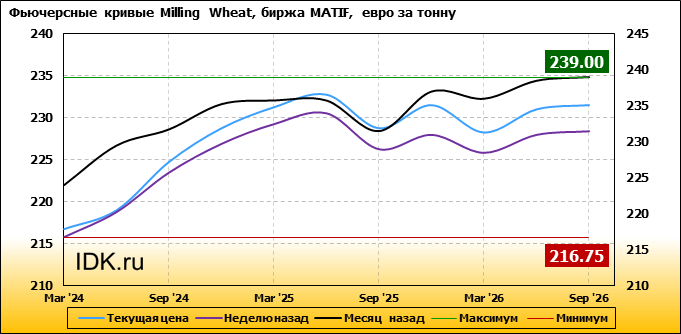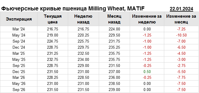 На 22.01.2024 стоимость пшеницы Milling Wheat на бирже MATIF по контракту Mar ’24 составила 216.75 евро за тонну. За прошедшую неделю стоимость пшеницы Milling Wheat не изменилась. Как мы видим на графике, фьючерсная кривая имеет периоды, когда более дальний фьючерс дешевле ближнего. Состояние бэквардации наблюдаем на следующих контрактах: Sep ’25; Mar ’26. Таким образом, трейдеры предполагают, что возможно превалирование предложения над спросом в указанные периоды.