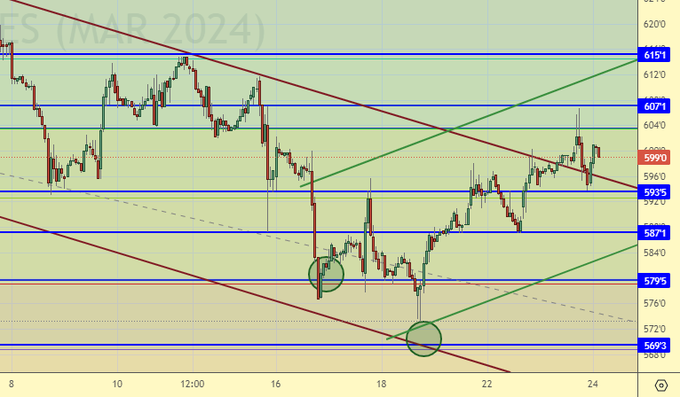 Рынок продолжает пытаться пройти выше 600.0. Пока это не получается. Отметим, что в случае обострения в районе Калининграда, учения НАТО, (учения ли?) увидим не только 600.0, но и 1500!!!
