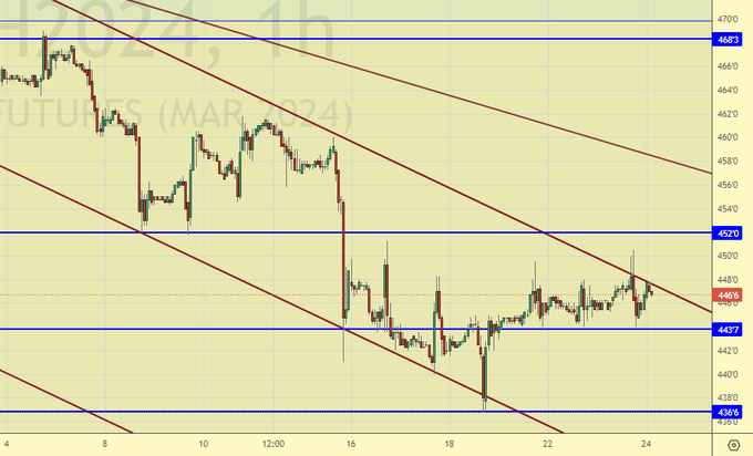 Вряд ли данную позицию можно расценивать как бычью. Если рынок сможет закрепиться выше 450.0, то тогда вернемся к рассуждениям о лонгах, а пока смотрим на 420.0.