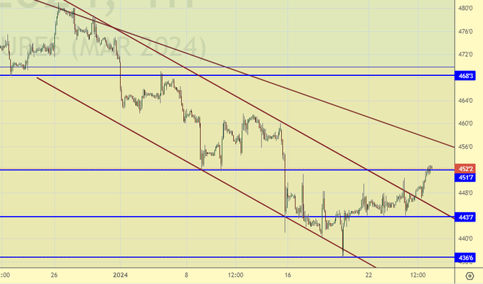 Продажа: нет. Кто в позиции от 460.4 и 458.4, держите стоп на 453.0. Цель: 420.0.
