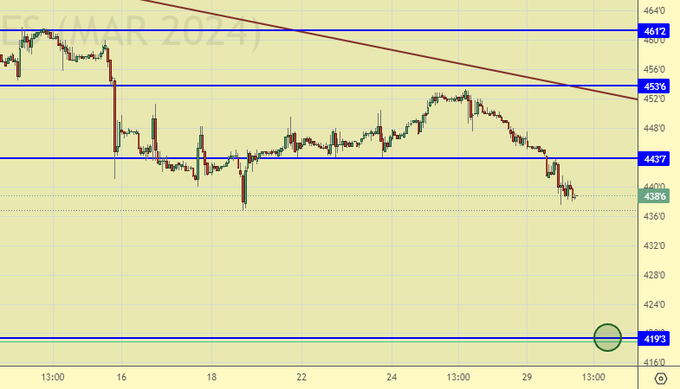 Рынок не дает нам возможности зацепиться за шорт в рамках наших прогнозов, для корректного входа в шорт нужен подход к 450.0. Провожаем глазами падение к 420.0 где и будем покупать, как это и планировалось еще месяц назад.