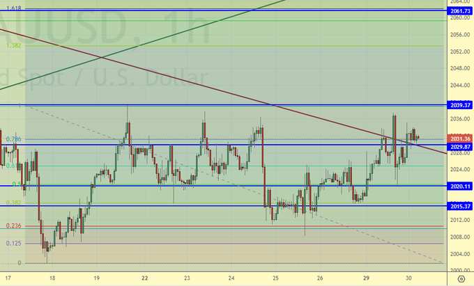 Быки упрямо лезут на отметку 2040. Это вызывает неприятные ощущения у продавцов, но на данный день и час сопротивление не прорвано. Сегодня, на фоне ожидания решения ФРС, мы вряд ли сможем пройти вверх, а вот завтра возможен выброс вверх к 2050. Смогут ли там быки закрепиться пока не ясно, но пропускать формирование хода вверх по золоту нельзя.