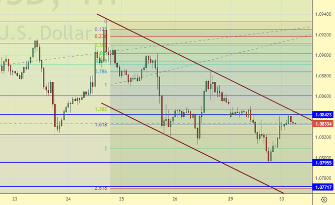 Рисуем, с некоторой неохотой, падающий канал. Рынок занимает равновесное положение перед заседанием ФРС. Авансов доллару никто не спешит выписывать, а это может означать, что рынок не видит причин для усиления доллара даже при сохранении текущей ставки. Но на касание 1.0710 мы пока еще можем рассчитывать. Если не сегодня, то завтра.