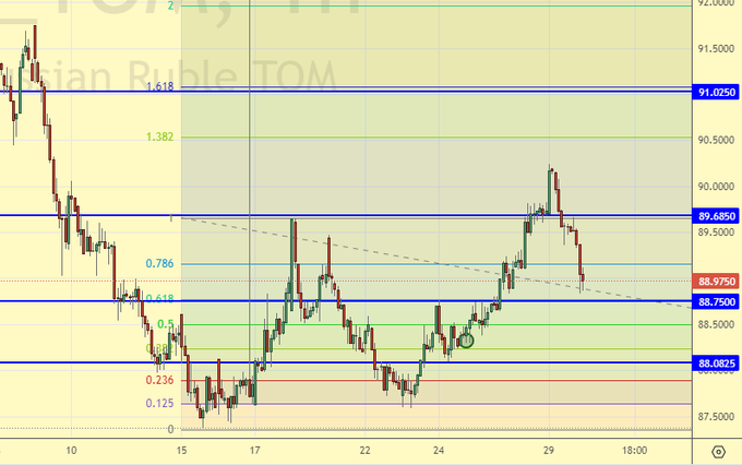 В случае падения ниже 88.70, появятся предпосылки для укрепления рубля. Пока этого не произошло, доллар смотрится сильнее. Несмотря на ежедневную продажу валюты на 16.5 млрд. рублей пара не смотрится сильно.