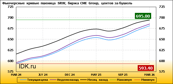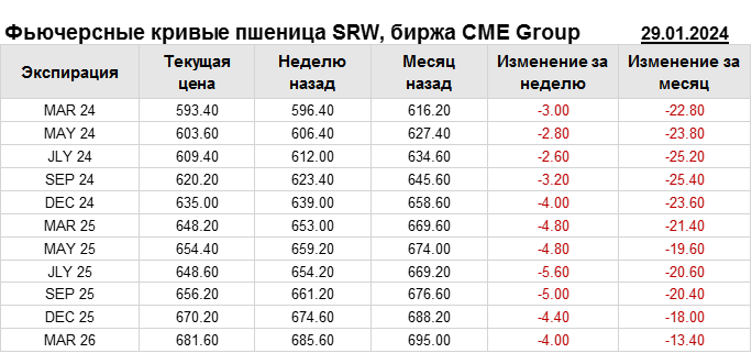 На 29.01.2024 стоимость пшеницы SRW на бирже CME Group по контракту MAR 24 составила 593.4 цента за бушель. За прошедшую неделю стоимость пшеницы SRW упала на 3 цента/бушель. Как мы видим на графике, фьючерсная кривая имеет периоды, когда более дальний фьючерс дешевле ближнего. Состояние бэквардации наблюдаем на следующих контрактах: JLY 25. Таким образом, трейдеры предполагают, что возможно превалирование предложения над спросом в указанные периоды.
