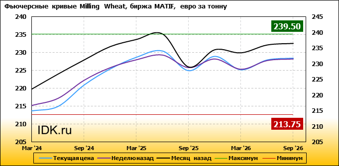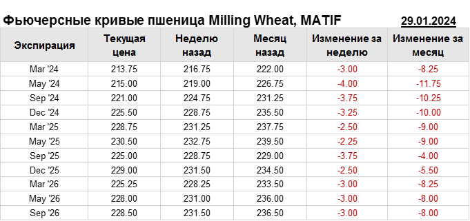 На 29.01.2024 стоимость пшеницы Milling Wheat на бирже MATIF по контракту Mar ’24 составила 213.75 евро за тонну. За прошедшую неделю стоимость пшеницы Milling Wheat упала на 3 евро/тонна. Как мы видим на графике, фьючерсная кривая имеет периоды, когда более дальний фьючерс дешевле ближнего. Состояние бэквардации наблюдаем на следующих контрактах: Sep ’25; Mar ’26. Таким образом, трейдеры предполагают, что возможно превалирование предложения над спросом в указанные периоды.
