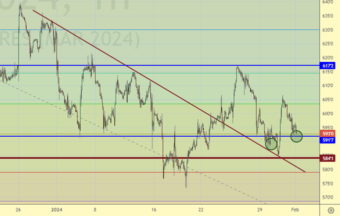 Пшеница (мартовский контракт, CME Group, исполнение 14.03.2024)