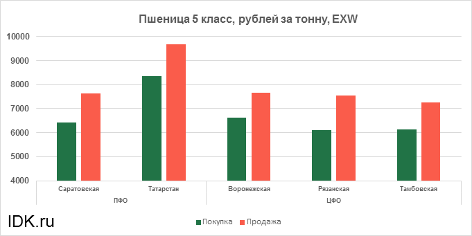 За прошедшую неделю с 29.01.2024 по 02.02.2024 средняя цена на пшеницу 5-го класса, согласно выставленным заявкам трейдеров, упала по всем округам на 63 рубля. Средняя цена составляет 7079 рублей за тонну.