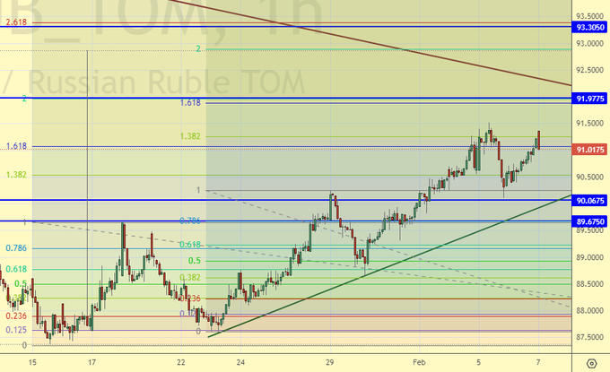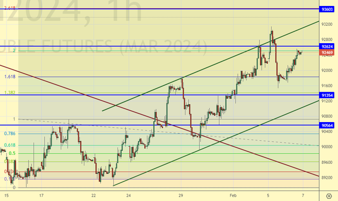 Рынок прошел вверх большую часть пути, позавчерашнего сброса вниз. Очень будет непросто продавцам сегодня удержаться под 91.50. Если данный уровень будет пройден вверх, то мы отправимся для начала на 93.30, далее 97.00.