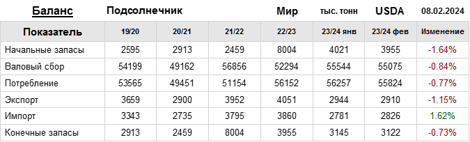 За прошедший месяц министерство сельского хозяйства США (USDA) на 08.02.2024 пересмотрело Баланс подсолнечника для Мира в сезоне 23/24 следующим образом: