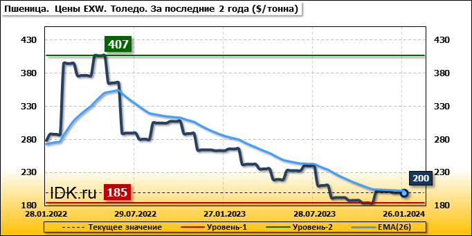 Внутренние цены на пшеницу SRW в городе Толедо (США) упали на 1.8 $/т. и на отчетный месяц составляют 199.82 доллара за тонну.