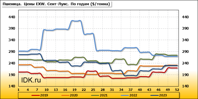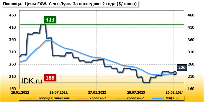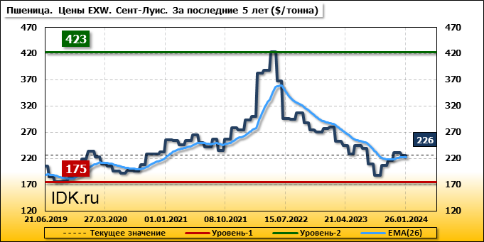 За прошедший месяц внутренние цены на пшеницу SRW в Сент-Луисе (США) упали на 4.8 $/т. и на отчетный месяц составляют 225.58 доллара за тонну.