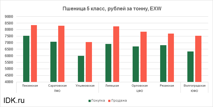 За прошедшую неделю с 12.02.2024 по 16.02.2024 средняя цена на пшеницу 5-го класса, согласно выставленным заявкам трейдеров, выросла по всем округам на 325 рублей. Средняя цена составляет 7221 рубль за тонну.