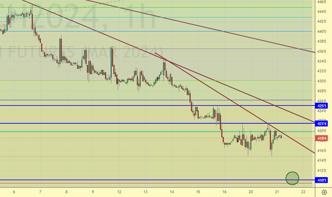 Ждем удара вниз в 410.0 и отскок. При подходе к 410.0 можно купить. Покупки от 385.0, если рынок позволит, можно сделать долгосрочными. Пока мы видим, что быкам не удается сломить падающую тенеднцию.