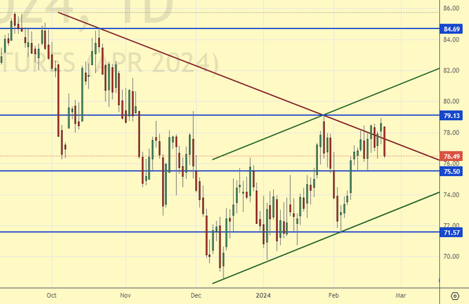 Сценарий роста: перешли на мартовский фьючерс, дата экспирации 28 марта. Нужен рост выше 85.00. Пока он не произошел, вверх не смотрим.