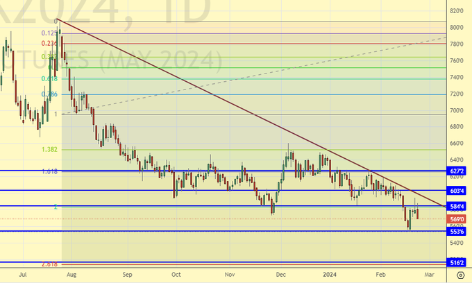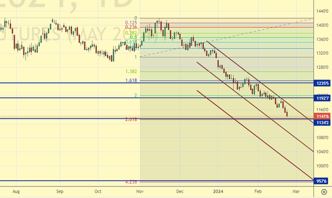 Сценарий роста: перешли на майский фьючерс, дата экспирации 14 мая. Быкам пока тяжело. Кукуруза рухнула, а пшеница сама по себе не сможет сейчас расти.