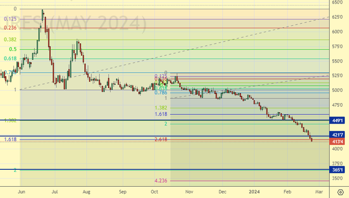Кукуруза рухнула на бирже в Чикаго, что должно создать медвежий фон и для пшеницы. Сейчас спред между культурами разошелся до 150 центов на майских контрактах. Основная кормовая культура может снизится еще на 10% в рамках текущего падения до уровня 370 центов за бушель. Пшеница способна также уйти вниз к уровню 520 центов за бушель.