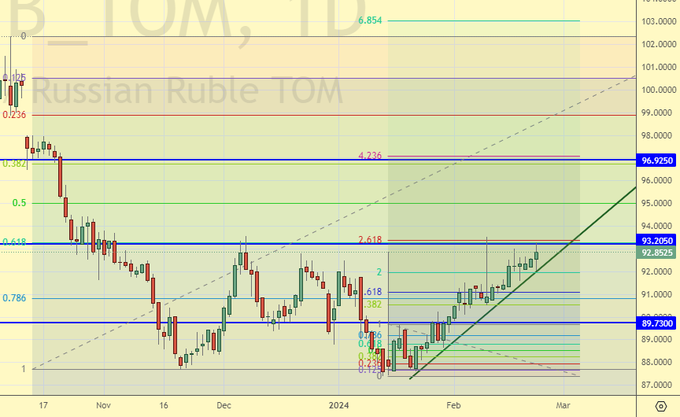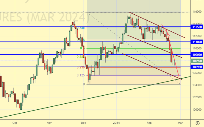 Сценарий роста: рассматриваем мартовский фьючерс, дата экспирации 21 марта. Интересный район для покупок с технической точки зрения. Мы не можем его игнорировать и вынуждены отработать, несмотря на мрачный фон от новых санкций.
