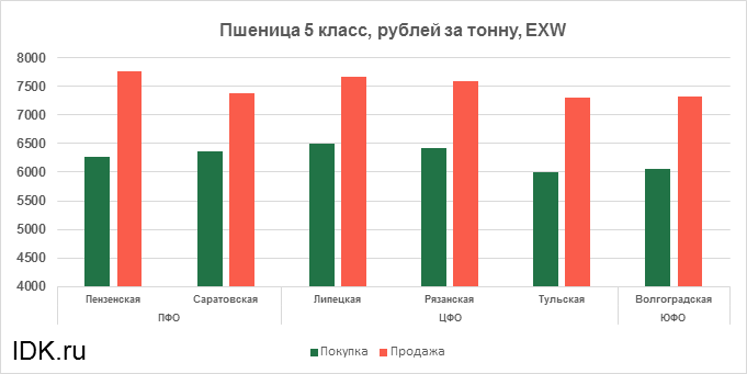 За прошедшую неделю с 19.02.2024 по 23.02.2024 средняя цена на пшеницу 5-го класса, согласно выставленным заявкам трейдеров, упала по всем округам на 349 рублей. Средняя цена составляет 6873 рубля за тонну.