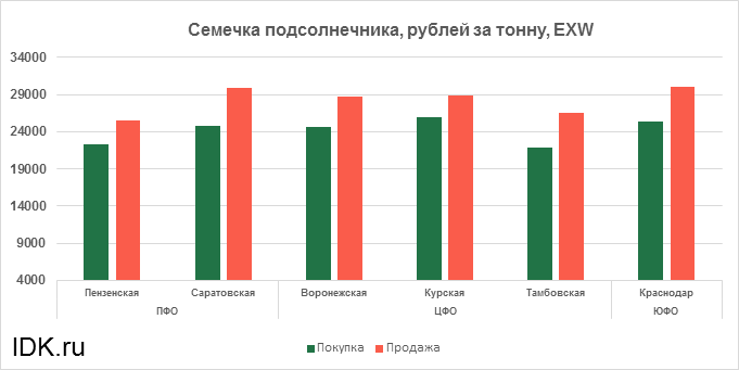 За прошедшую неделю с 19.02.2024 по 23.02.2024 средняя цена семечки подсолнечника, согласно выставленным заявкам трейдеров, упала по всем округам на 602 рубля. Средняя цена составляет 26074 рубля за тонну.